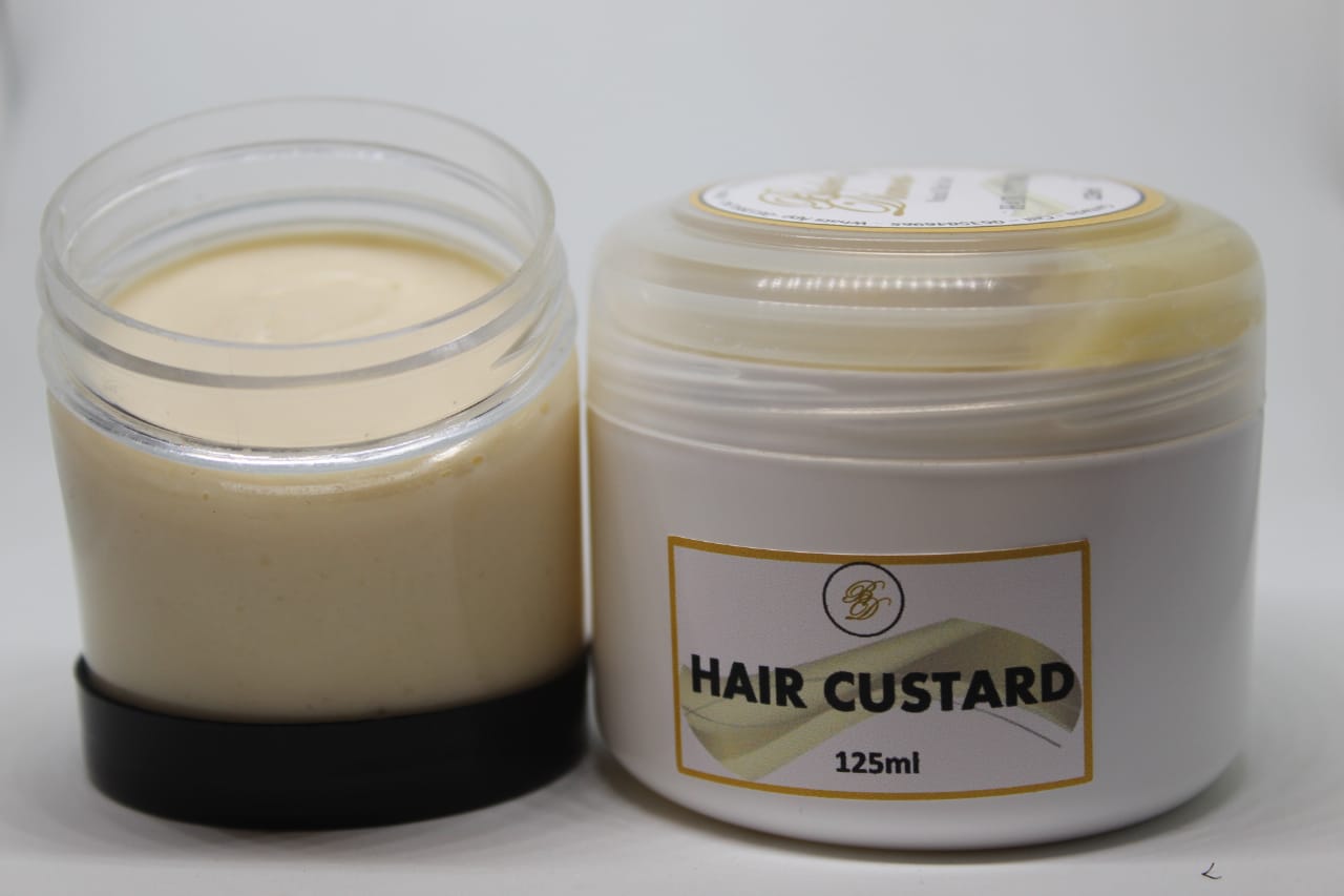 A custard has a higher water concentration than a typical hair gel, hence it is less flaky and provides less hold when applied to the hair. It won’t keep your edges in place but it will hydrate the hair and cause less frizz.